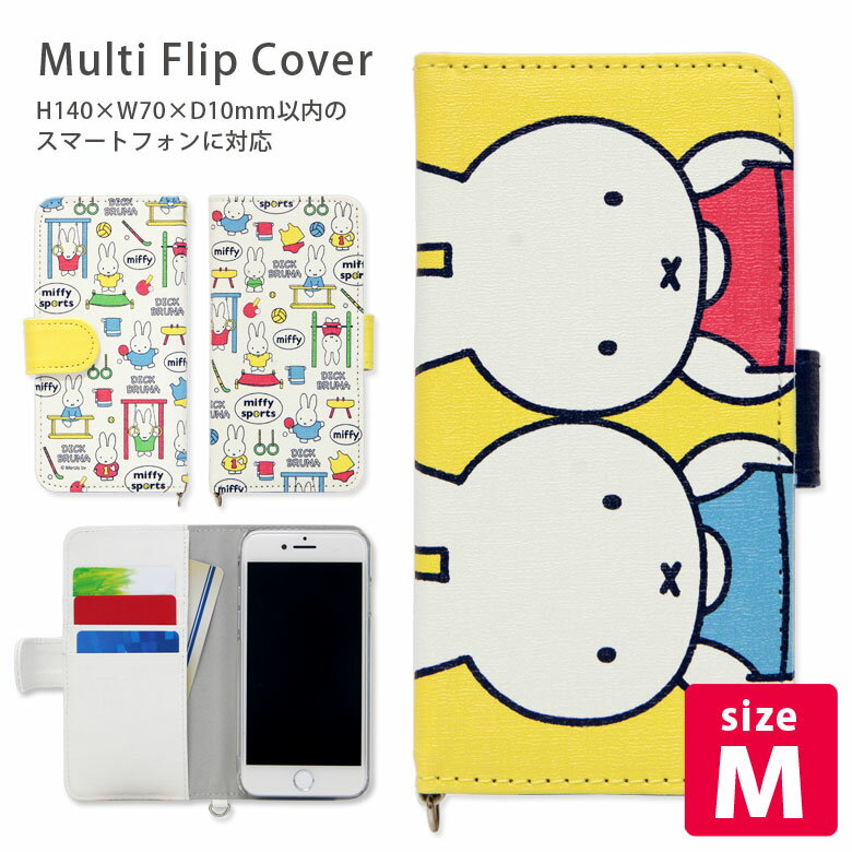 ミッフィー 手帳型 スマホカバー Mサイズ スポーツ 汎用 粘着パット貼付タイプ スマホ キャラクター 黄色 総柄 ピンク カワイイ マルチフリップカバー スマートフォン 多機種に対応 カードポケット付き かわいい スマホケース