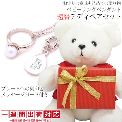 真珠のベビーリングペンダントと還暦ベアのセット ベビーリングペンダントは記念の日付やお名前を刻印できるプレート付き。