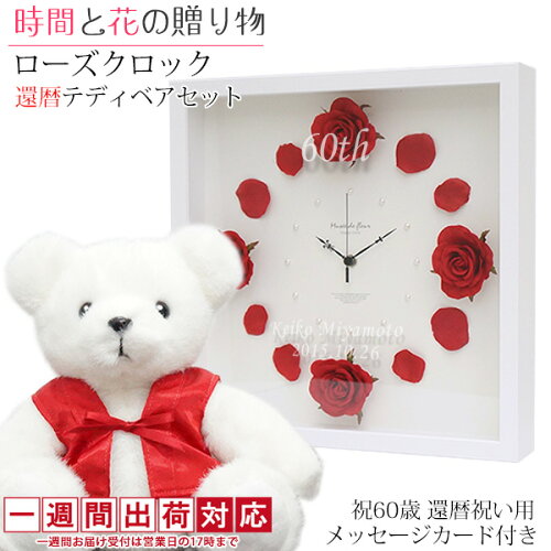 還暦祝い 女性 プレゼント 赤いちゃんちゃんこを着た 還暦ベアセット <ローズクロック 赤 メッセージカード付き 1週間発送コース> バラ 花時計 薔薇 名入れ メッセージ 刻印 熊 ぬいぐるみ 60歳 母 贈り物 ギフト
