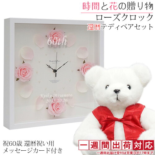 還暦祝い 女性 プレゼント 赤いちゃんちゃんこを着た 還暦ベアセット <ローズクロック ピンク メッセージカード付き 1週間発送コース> バラ 花時計 薔薇 名入れ メッセージ 刻印 熊 ぬいぐるみ 60歳 母 贈り物 ギフト
